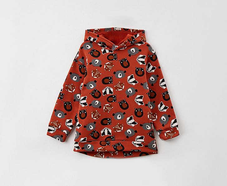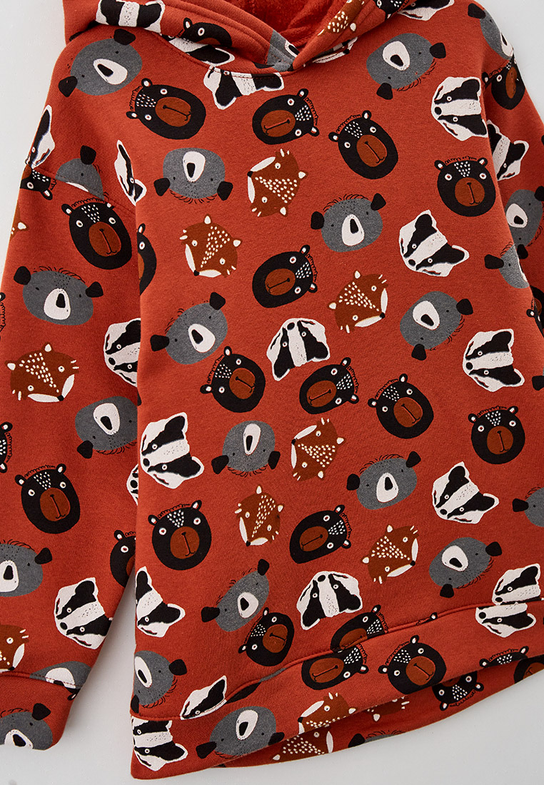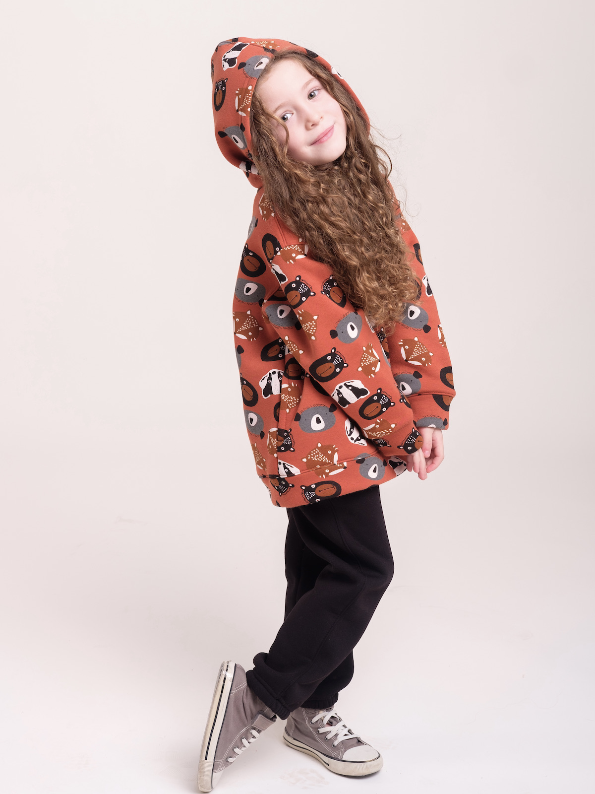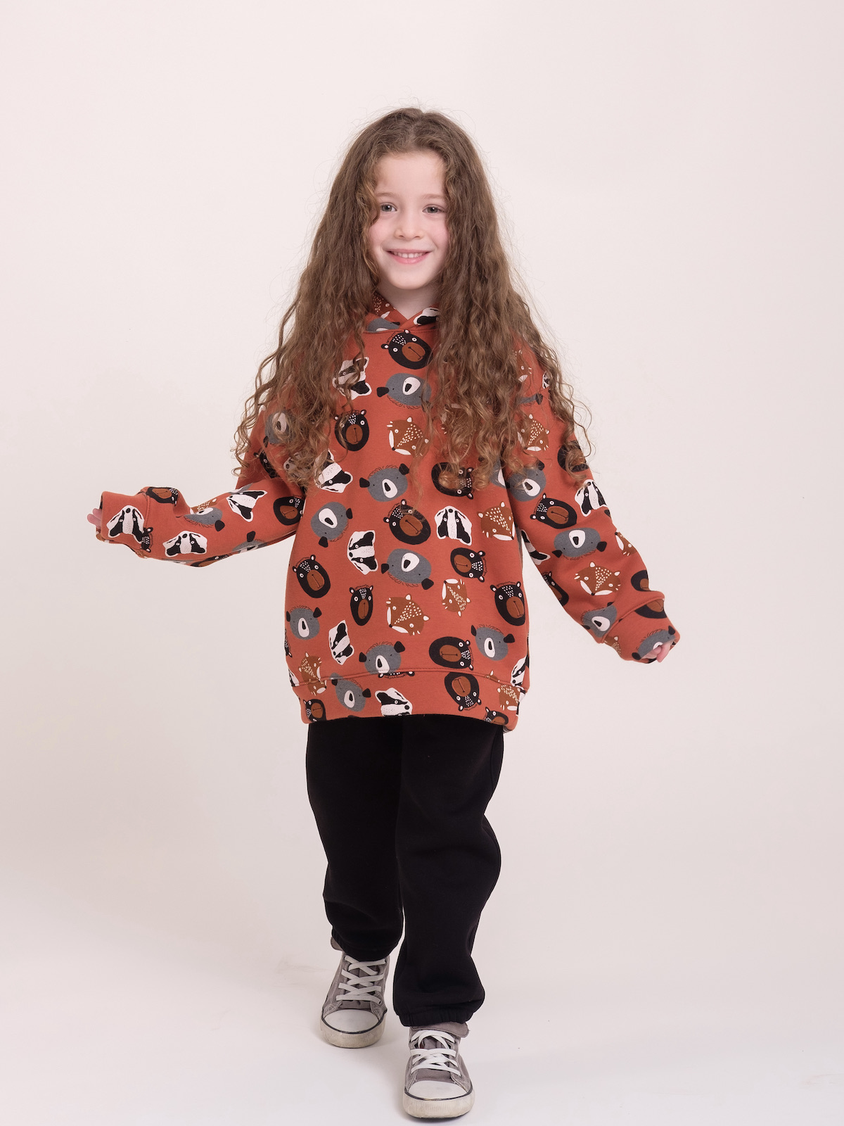 Толстовка с капюшоном сочного терракотового цвета с ярким принтом. Сшит из качественного трехниточного футера с начесом. Модель не укороченная, имеются карманы. После первых стирок костюм может немного полинять, но это не отразится на основном цвете, он останется таким же ярким. Футер с начесом неизбежно может оставлять ворс на одежде, но после нескольких стирок этого не будет.