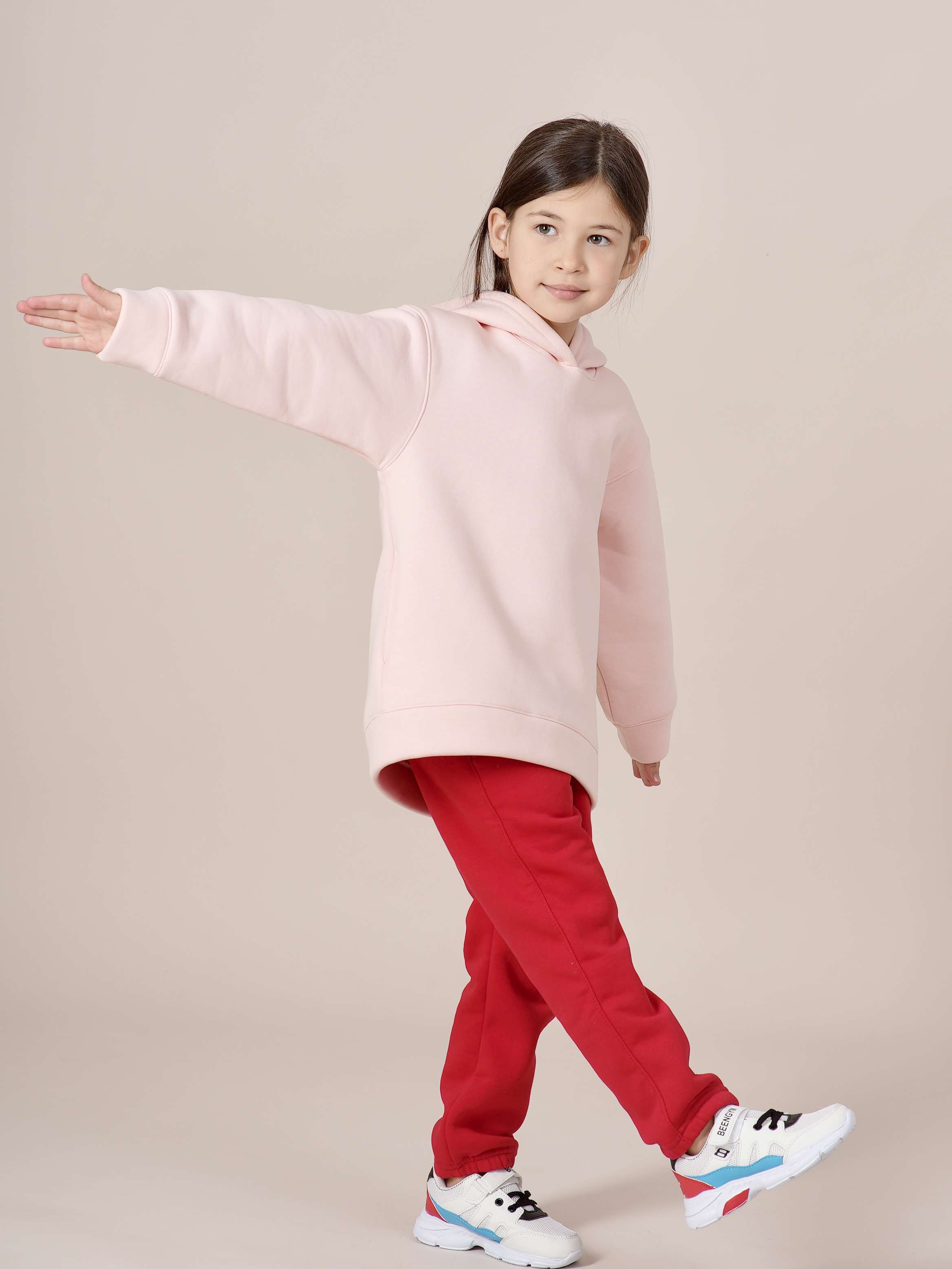 Костюм с толстовкой с капюшоном розового цвета и брюками ярко-красного цвета. Сшит из качественного трехниточного футера с начесом. По бокам у толстовки и брюк есть карманы. Модель верха не укороченная. После первых стирок брюки могут немного полинять, но это не отразится на основном цвете, он останется таким же ярким. В связи с этим, первые разы рекомендуется стирать отдельно толстовку и брюки. Футер с начесом неизбежно может оставлять ворс на одежде, но после нескольких стирок этого не будет. Хотели бы отметить, что фотография не передает реальный цвет изделия, брюки ярко-красного цвета, без малинового оттенка, как это может показаться на фото. Модель толстовки не укороченная. У брюк на поясе еть широкая резинка, не давящая на живот.